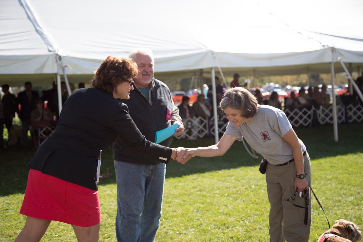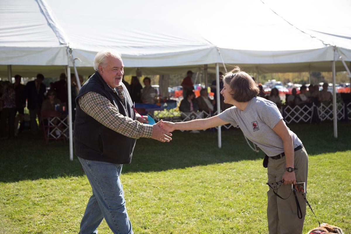 of the Kanadasaga Kennel Club presenting the check to Handler Pat Tolchin